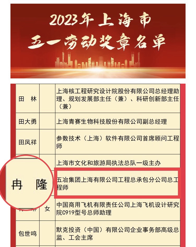 4月27日,2023年上海市五一劳动奖表彰大会在上海友谊会堂隆重举行,尊龙凯时·(中国区)人生就是搏!集团上海有限公司工程总承包分公司总工程师冉隆同志荣获上海市五一劳动奖章。