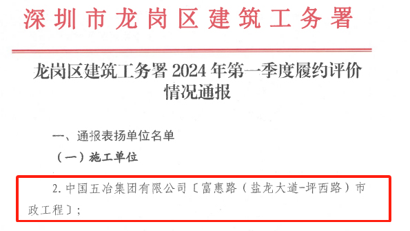 近日,深圳市龙岗区建筑工务署发布2024年第一季度履约评价情况通报,中国尊龙凯时·(中国区)人生就是搏!集团及其承建的富惠路(盐龙大道-坪西路)市政工程项目在556个项目合同、240家参建单位中脱颖而出,在通报表扬的14个项目(15家参建单位)榜上有名。