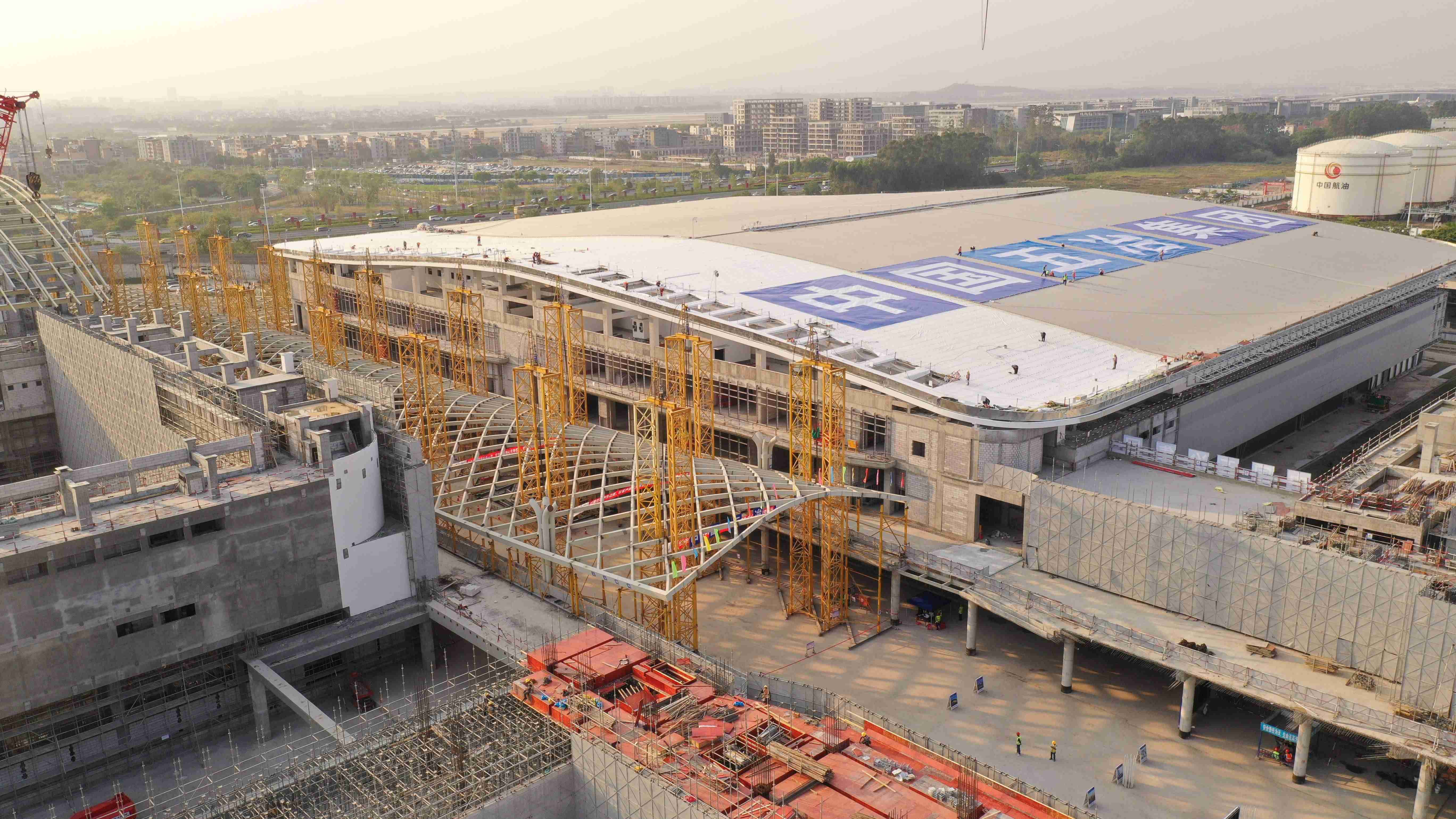 项目地处广东省广州市空港经济区核心位置,拥有全球“顶流”的交通枢纽优势,项目总建筑面积约25.35万平方米,由8个展馆、主登录厅、中心通廊组成,用钢量约1.4万吨。其中,中心通廊作为各展馆之间的室外连接平台,是一道呈东西向布局的狭长结构,由树形支撑与单层空间曲面网壳结构结合而成,平面尺寸为26.4米×415米,最高处约30.8米,跨度约26.4米,分两个提升单元,总重约1200吨。本次提升区域的网壳结构重量约620吨,最大提升高度为17米,经过两阶段累积6个小时的高空提升,本区域网壳平稳提升至指定设计高度。