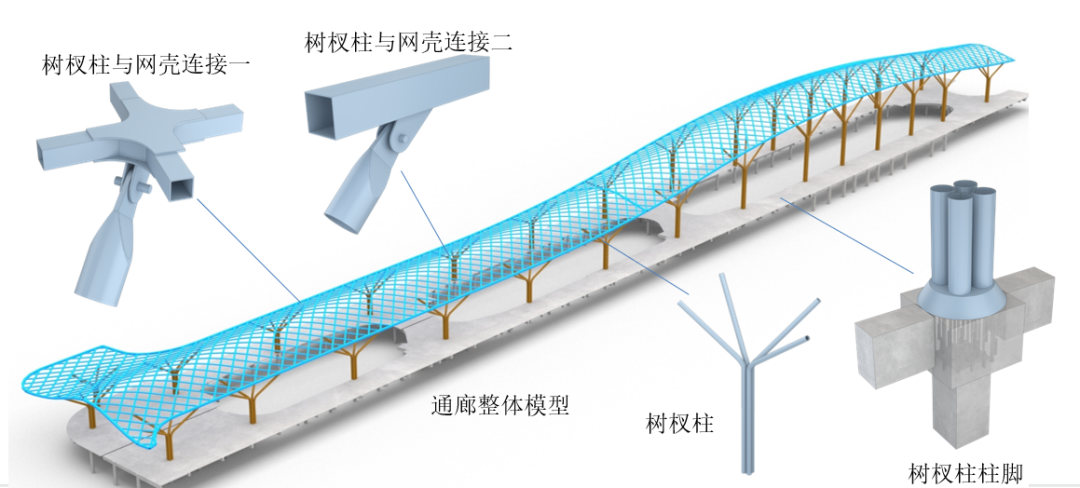 中心通廊作为串联项目各分展馆的关键枢纽,采用树形支撑与单层空间曲面网壳相结合的结构形式,整体尺寸达26.4米宽、415米长,最高点达30.8米,相当于10层楼高。本次作业完成了剩余69米长、185吨重的网壳结构的提升工程,与前两阶段已就位的1015吨主体结构实现毫米级精准对接。整个提升过程分阶段累计高空作业10小时,最终将这一“钢铁巨构”平稳举升到位。